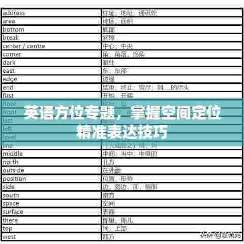 在我们的日常生活中,方位和空间的认知对于导航、交流以及进行各种活动时至关重要,随着全球化的进程,英语作为一种国际语言,在表达方位方面扮演着重要角色,本文将围绕“英语方位专题”展开讨论,帮助读者更好地掌握空间定位的表达方式。